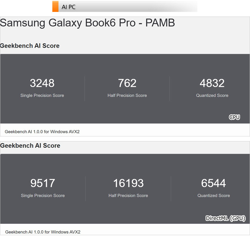 AI 전용 벤치마크 툴을 이용해 AI 성능 테스트를 진행하고 있는 모습으로 AI 에 특화된 CPU가 탑재된 모델답게 높은 스코어를 보여주었다. (전작대비 DirectML 의 스코어가 확연하게 높아진 것이 눈에 띈다.)