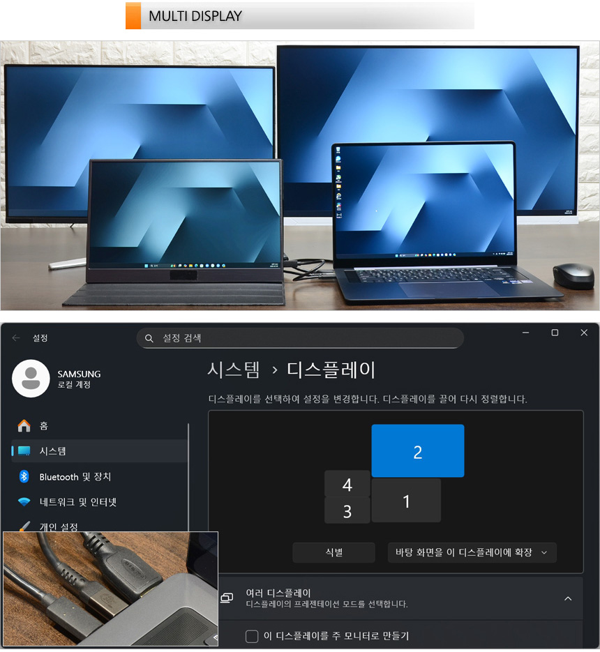 도입부에서 언급한 것과 같이 3개의 모니터 연결이 가능해 노트북 디스플레이 포함 4개의 모니터 사용이 가능하다. 상단의 사진은 연결 테스트를 진행하고 있는 모습으로 원활하게 작동하는 것을 확인할 수 있었다.