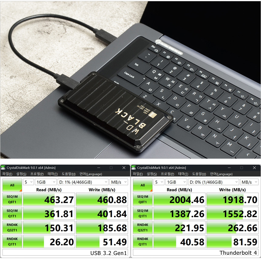 썬더볼트 4 단자를 지원해 빠른 데이터 전송이 가능하다. 상단의 사진은 외장 SSD (USB 3.2 Gen2x2 지원제품) 를 이용해 테스트를 진행하고 있는 모습으로 USB 3.2 Gen1과 확연한 차이를 보여주었다. 대용량 데이터 전송이 잦은 유저들이라면 만족하며 사용할 수 있을 것이다.