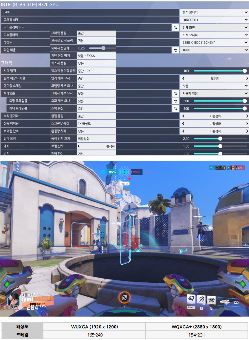 오버워치2를 플레이 하고 있는 모습으로 해상도에 상관없이 부드럽게 게임을 즐길 수 있었다. 120Hz 주사율 특유의 부드러움을 만끽할 수 있을 것이다. (다른 게임들과 달리 프레임이 요동치는 모습을 보여주었으며 해상도별 프레임 차이가 크지 않았다.)