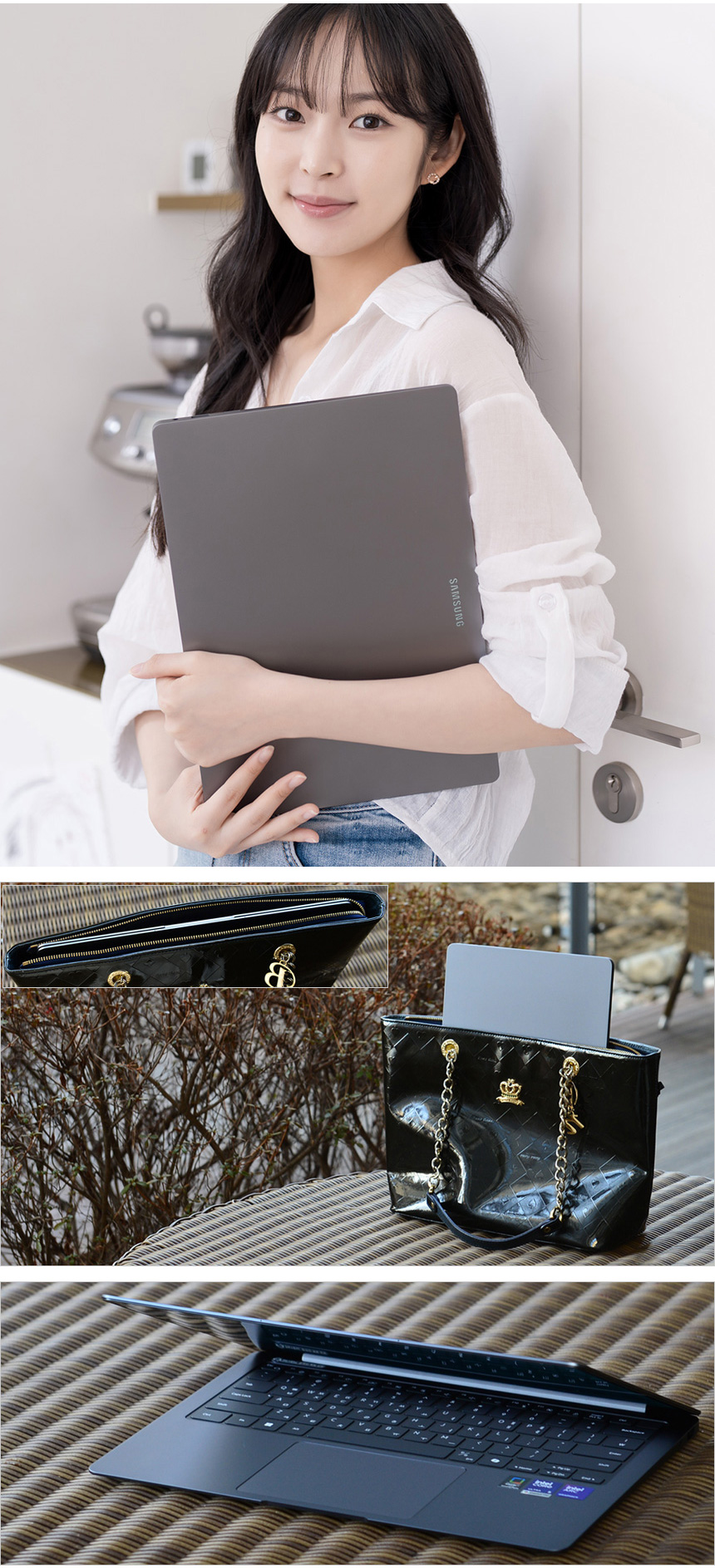 노트북용 백팩에 넣고 다녀야 하는 일반 노트북들과 달리 작은 크기와 날렵한 두께로 서류가방은 물론 여성들이 들고 다니는 숄더백 등에 넣고 다니며 이동할 수 있다. 특히 도입부에서 강조한 것과 같이 30시간 이상 사용 가능한 긴 배터리 사용시간을 지원하고 PD충전도 가능해 장시간 외부에서 편하게 사용할 수 있다.