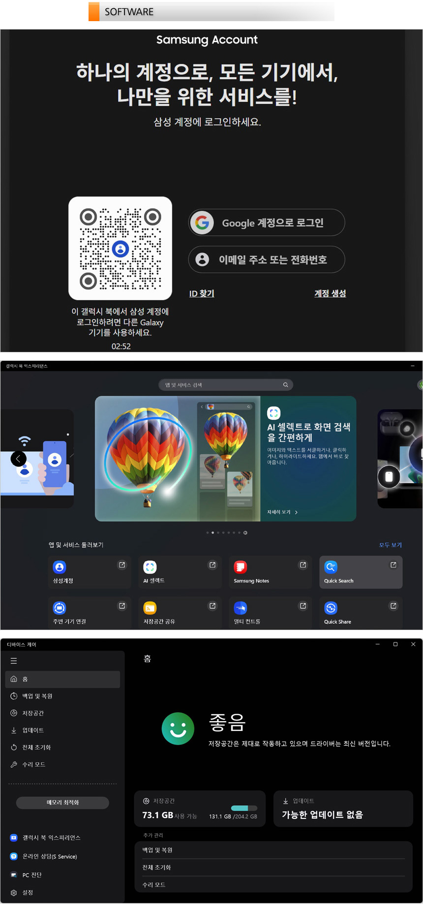 삼성 어카운트에서 QR코드 로그인을 제공해 삼성계정이 필요한 앱을 편하게 실행할 수 있으며 갤럭시북 익스피리언스를 실행하면 설치된 앱을 손쉽게 실행할 수 있다. (기존 갤럭시북에서 지원하던 앱 대부분이 설치되어 있다.) 또한 디바이스 케어를 실행하면 업데이터가 가능해 최상의 컨디션으로 노트북을 사용할 수 있다. (노트북 출시 초기이기 때문에 드라이버나 바이오스가 빈번하게 업데이트 될 것이다. 자주 디바이스 케어를 실행하기 바란다.)