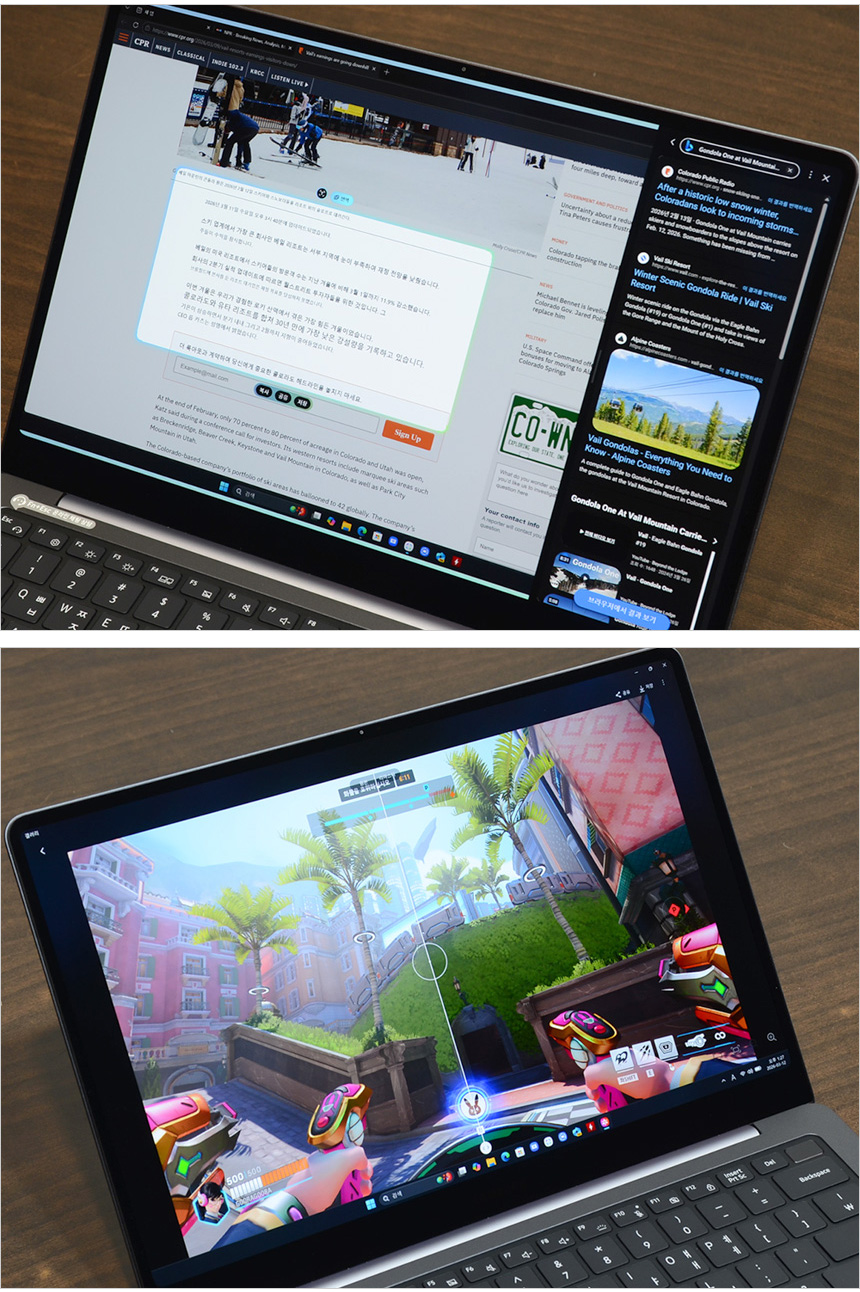 화면 크기는 작지만 WQXGA+ 고해상도를 지원하며 3면 슬림 베젤로 탁 트인 시야감을 제공해 2개 이상의 창을 띄어두고 사용할 수 있다. 또한 터치인식 테스트를 진행했는데 물 흐르듯 부드러운 터치감을 보여주어 편하게 노트북을 조작할 수 있었다.