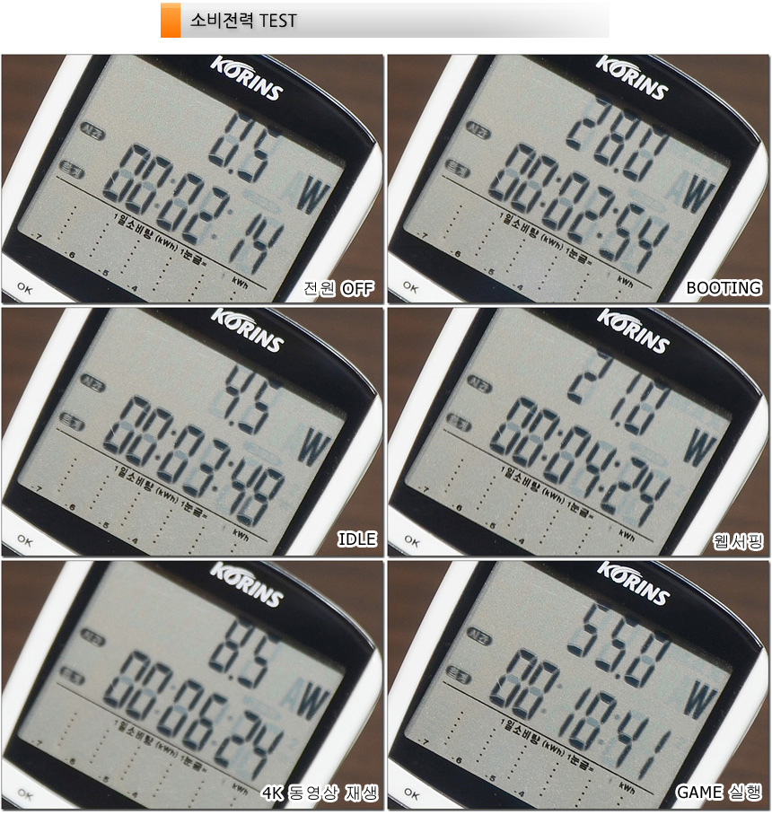 소비전력 테스트를 진행하고 있는 모습으로 (밝기 50%, 최고성능 모드) 캐주얼한 작업에서는 낮은 소비전력으로 작동했으며 높은 성능을 필요로 하는 게임에서는 50W 까지 소비전력이 올라가는 것을 확인할 수 있었다. (40W~50W 대에서 수시로 변동했다.)