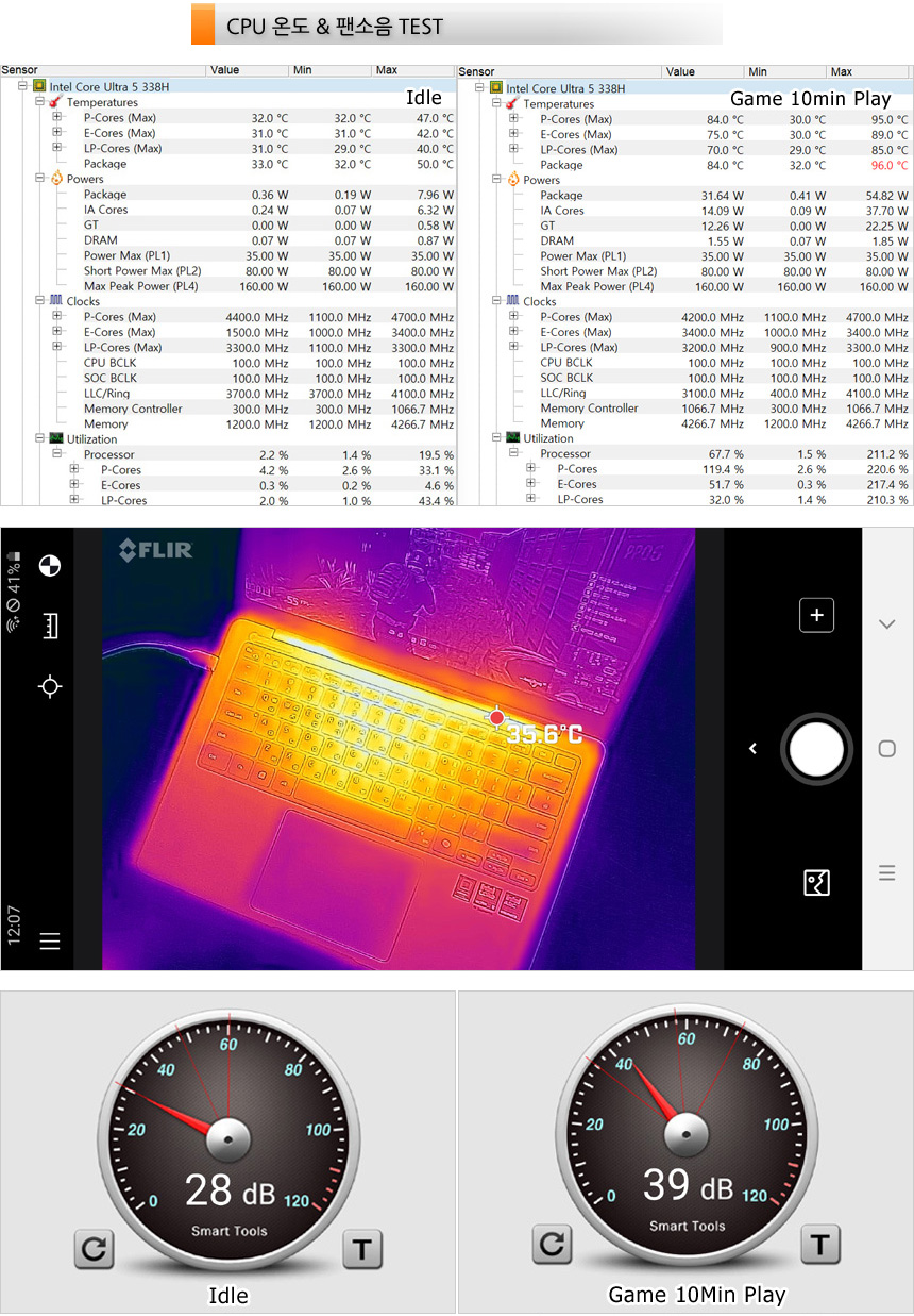 인텔코어 울트라 5 338H의 온도 테스트를 진행하고 있는 모습으로 (최고 성능 모드, 실내온도 13도) 아무것도 하지 않은 Idle 상태에서는 30도 초반대로 동작했으며 10분간 게임을 실행하고 측정했을 때 80도 중반까지 온도가 올라가는 것을 확인할 수 있었다. (순간적으로 90도 이상으로 올라가긴 하지만 대부분의 게임상황에서 70도 중반~80도 중반의 온도를 보여주었다.)