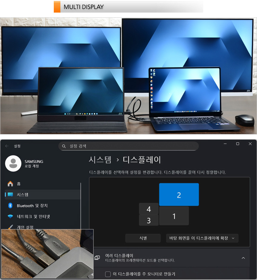 썬더볼트 4 단자를 2개 지원해 HDMI를 포함한 3개의 모니터를 추가할 수 있다. (특히 HDMI 2.1을 지원해 8K나 4K 모니터 연결이 가능하다.) 상단의 사진은 멀티 디스플레이 테스트를 진행하고 있는 모습으로 원활하게 작동하는 것을 확인할 수 있었다. 멀티테스킹이 필수적인 직장인 이나 대학생들이 특히 유용하게 활용할 수 있을 것이다.