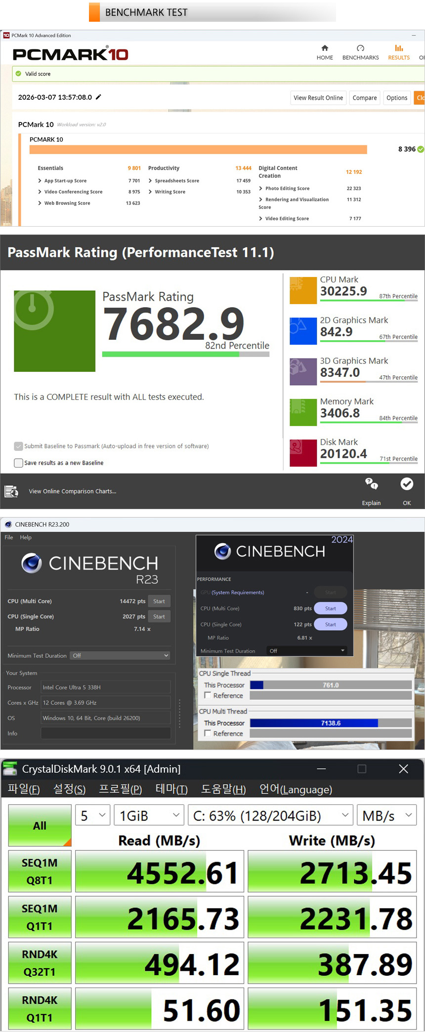 휴대성에 특화된 노트북은 성능이 떨어진다는 속설은 더 이상 성립하지 않는다는 것을 확인한 테스트였다. 인텔에서 새롭게 발표한 팬서레이크의 성능이 진일보해 구형 모델들을 압도하는 강력한 성능을 경험할 수 있게 되었다. 특히 인텔 아크 내장그래픽의 성능을 탄성을 자아낼 만큼 좋아진 것이 인상적이었다.