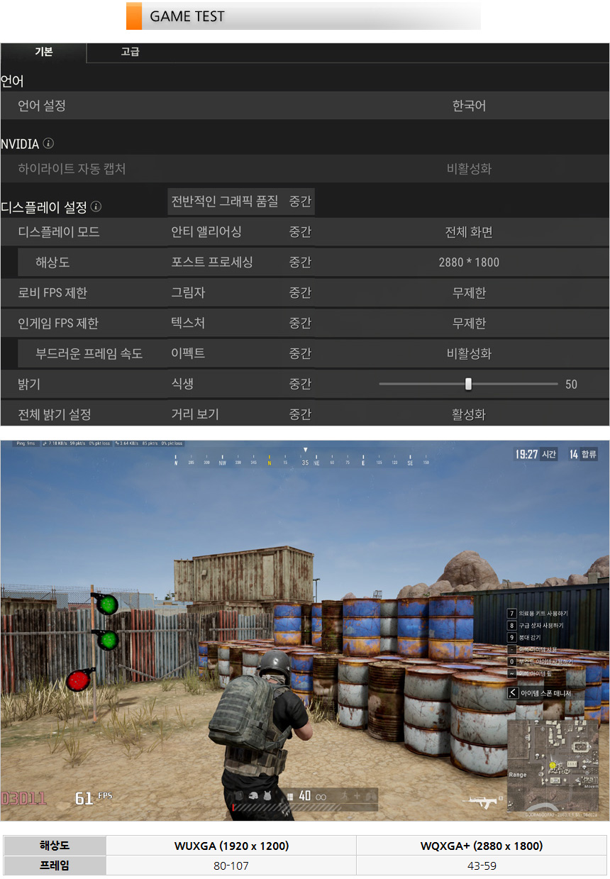게임 성능을 확인해 보도록 하자. 상단의 사진은 깡성능으로 승부해야 하는 배틀그라운드 (연습장)를 실행한 모습으로 WQXGA+ 해상도에서는 원활하게 실행되기는 하지만 약간 벅찬 모습을 보여주었다. 하지만 WUXGA 해상도에서는 프레임이 상당히 높아 원활하게 게임을 즐길 수 있었다.