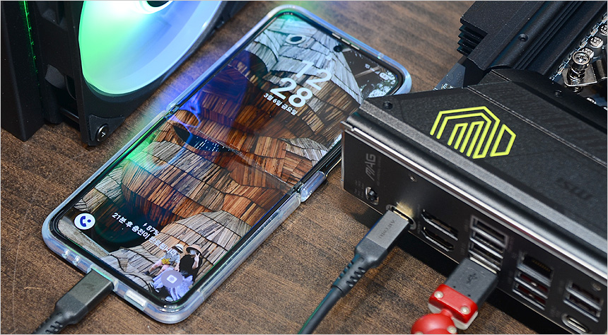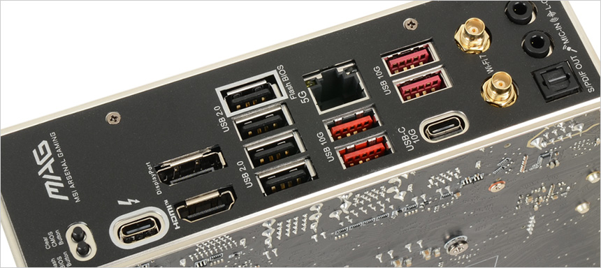 또한 S/PDIF를 포함한 오디오 단자가 설치되어 있고 5G 이더넷 단자와 Wi-Fi 7 무선랜 사용을 위한 2개의 안테나 단자가 설치되어 있는것도 눈에 띈다. (밀어주면 장착되도록 설계해 편의성을 높였다.) 내장그래픽 사용자를 위해 HDMI 2.1 단자와 DP 단자를 제공하며 5개의 USB 3.2 Gen2 단자 (C타입 포함) 와 4개의 USB 2.0 단자 지원으로 여유롭게 주변기기를 연결할 수 있다.