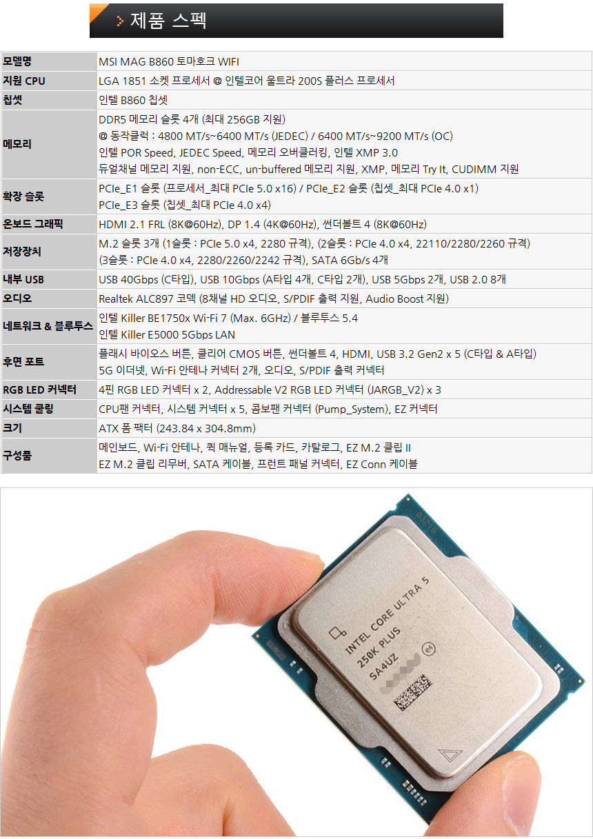 인텔코어 Ultra 200S Plus 완벽지원 메인보드, MSI MAG B860 토마호크 WIFI