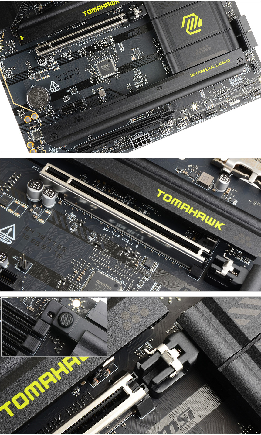 이 제품은 3개의 PCIe 슬롯이 설치되어 있다. 스틸아머가 설치된 첫 번째 슬롯은 PCIe 5.0 x16을 지원하며 (무거운 그래픽카드 장착으로 인한 슬롯의 파손 및 휘어짐 현상을 미연에 방지한다.) 두 번째 작은 슬롯은 PCIe 4.0 x1, 세 번째 큰 슬롯은 PCIe 4.0 x4를 지원한다.
