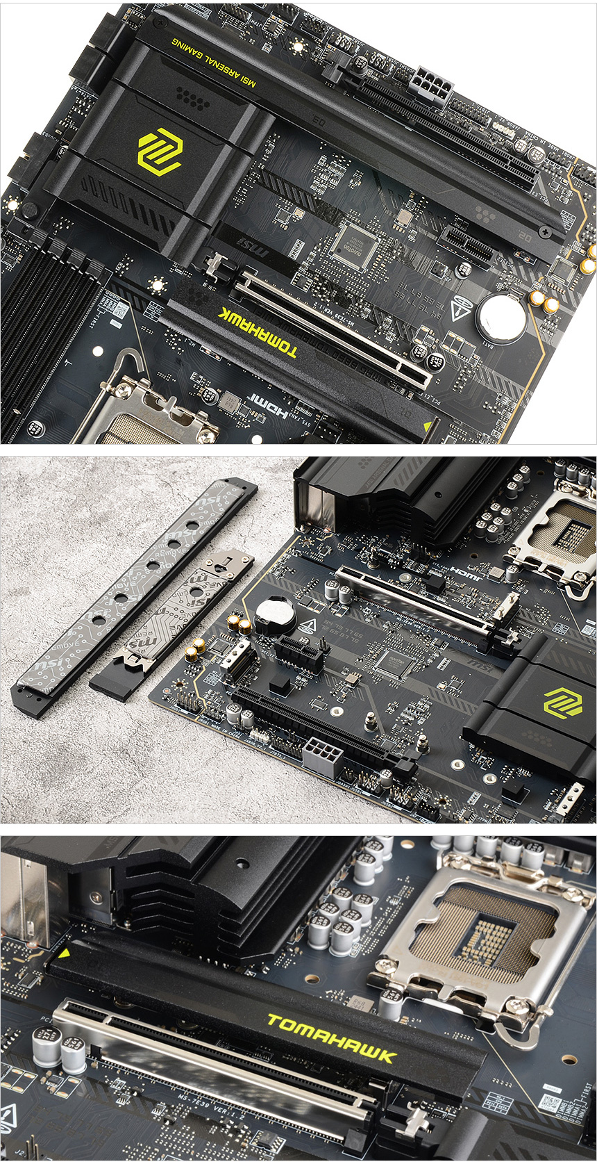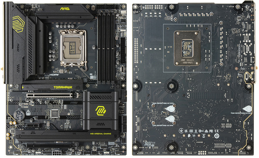 메인보드의 디자인은 기존 토마호크 시리즈와 같이 깔끔하고 고급스럽다. 히트싱크나 기판등 대부분의 부품에 블랙 컬러를 적용했을 뿐만 아니라 마감 완성도도 뛰어나 고급스러운 느낌을 자아내며 각종 슬롯이 일목요연 하게 배치되어 있으며 넉넉한 여유공간으로 그래픽카드나 쿨러 등을 장착할 때 간섭을 최소화 했다.