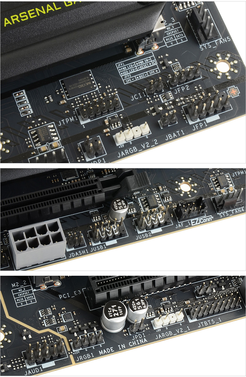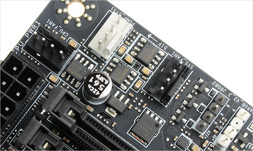 5개의 시스템 팬 단자를 지원해 다량의 팬을 연결해 시스템의 열을 식혀줄 수 있으며 오디오 핀 헤더도 설치된 것도 알 수 있다. 뿐만 아니라 미스틱 라이트 활용을 위한 RGB 핀 헤더, 2개의 USB 2.0 핀헤더를 제공하며 PCIe 전원 커넥터가 추가되어 하이엔드 급의 그래픽카드에 넉넉하게 전원을 공급할 수 있으며 1 to 3 EZ 케넉터 케이블과 전용 단자를 지원해 수냉쿨러나 쿨링팬 연결시 보다 쉽게 설치할 수 있다.