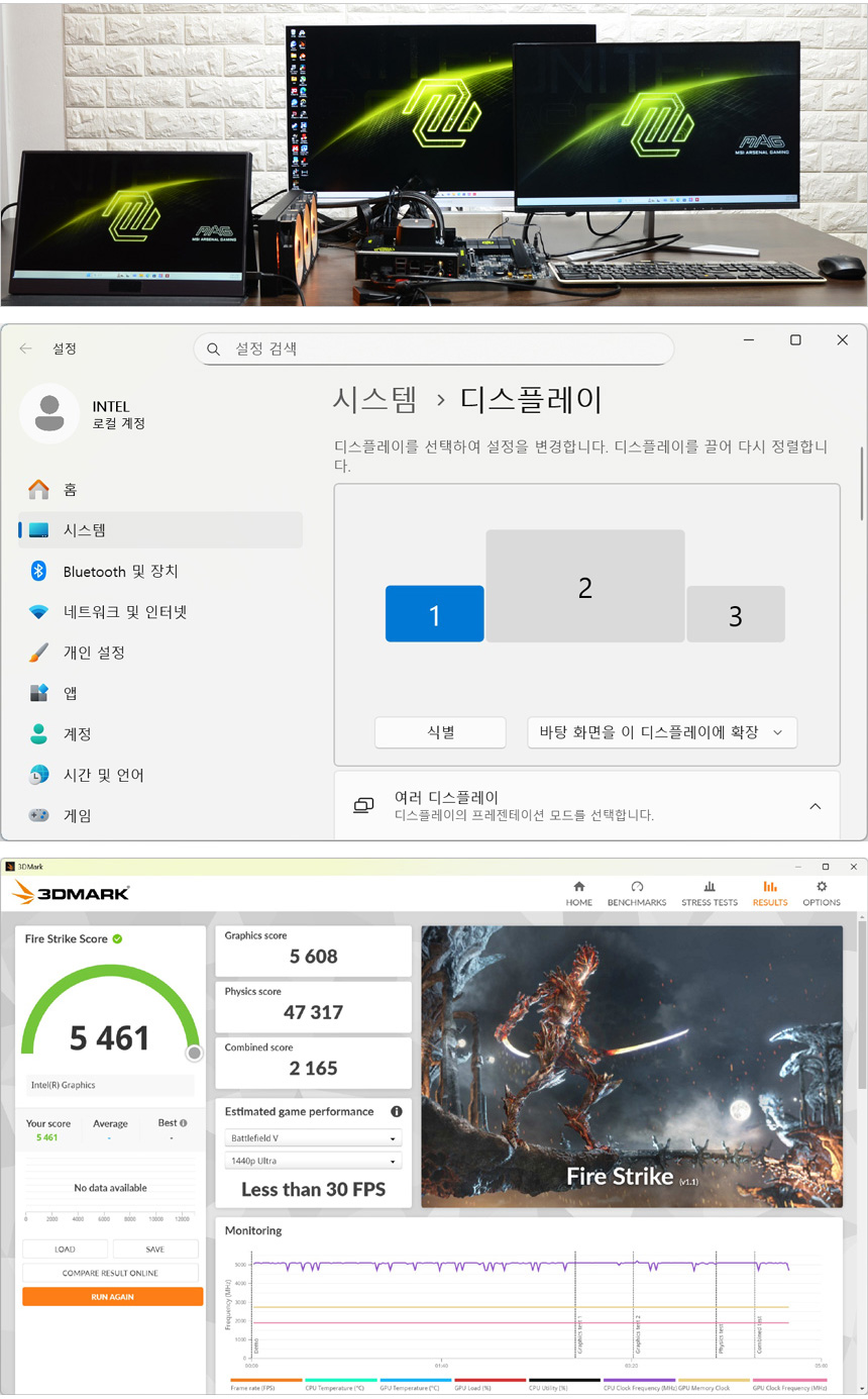 고급형 메인보드 답게 내장그래픽에서도 3개의 모니터 연결이 가능하다. (DP, HDMI, 썬더볼트 4) 상단의 사진은 4K와 2개의 FHD 모니터를 연결한 모습으로 완벽하게 작동하는 것을 확인할 수 있었다. 고성능 시스템이 필요하지만 그래픽카드는 사용할 필요가 없는 주식용 등에서 유용하게 활용할 수 있으며 내장그래픽 성능도 구형 메인보드 대비 높은 편이기 때문에 캐주얼한 게임을 즐긴다면 좋은 대안이 될 것이다. @ 참고로 기존에 테스트 했던 265K 대비 그래픽 스코어가 400점 정도 높아졌다.