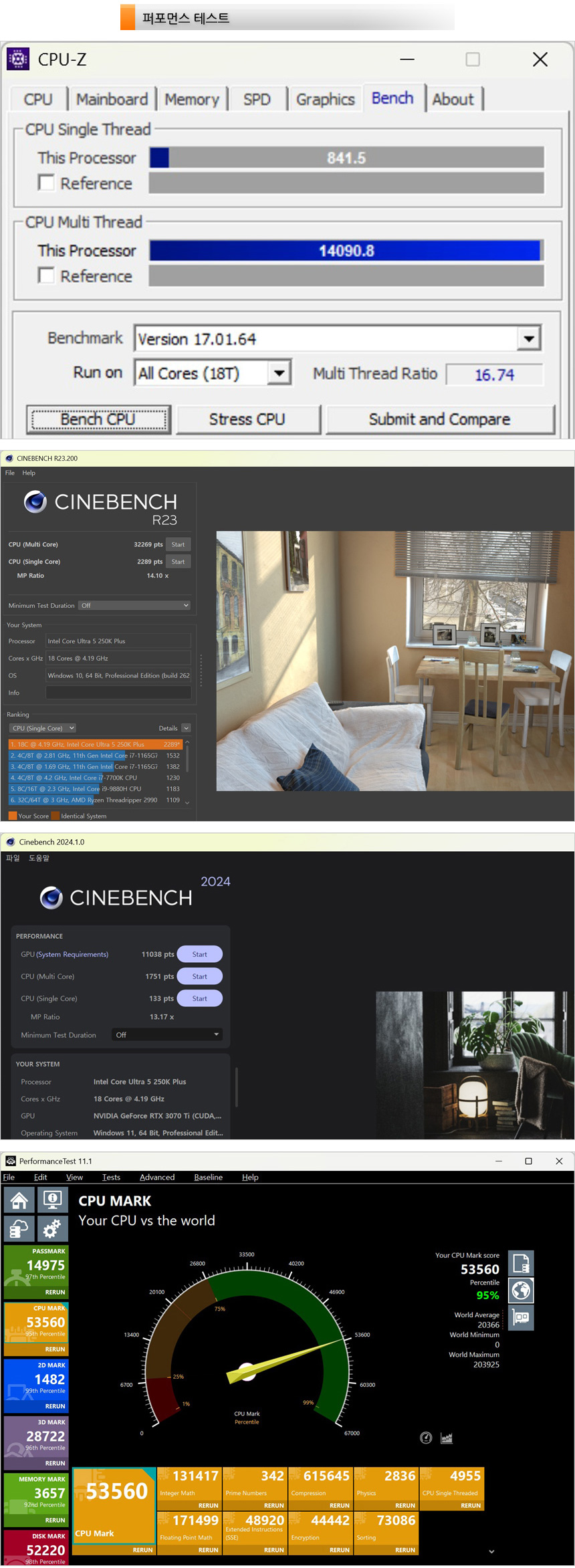 벤치마크 프로그램을 이용해 새롭게 출시된 인텔코어 울트라 250K Plus 의 성능을 확인하고 있는 모습으로 유저들이 충분히 체감할 수 있을 만큼 스코어가 높아진 것을 확인할 수 있었다. (전작인 245K 와 큰 차이를 보이며 상위 모델인 265K 에 근접한 모습을 보여주었다.) 전문작업이나 게임용으로 유용하게 사용할 수 있을 것이다.