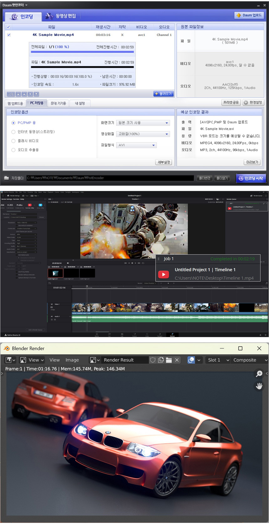 인코딩과 랜더링 테스트를 통해 작업성능을 확인하고 있는 모습으로 인코딩 시간이 6초 정도 단축되었으며 CPU 사용율이 극히 높은 블랜더 랜더링의 경우 22초 정도 시간이 단축되었다. (참고로 245K의 랜더링 시간은 1분 38초, 265K는 1분 10초였다.)