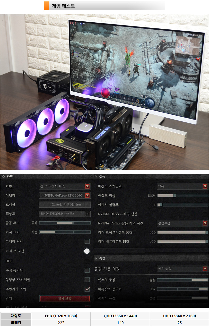 디아블로 4를 매우 높음 옵션에서 플레이 하고 있는 모습으로 테스트 시스템 정도면 문제없이 실행할 수 있다. 특히 최신 업스케일링 기술적용이 가능한 RTX50 이나 RX90 시리즈 메인보드를 사용하면 훨씬 쾌적하게 게임을 플레이 할 수 있다.