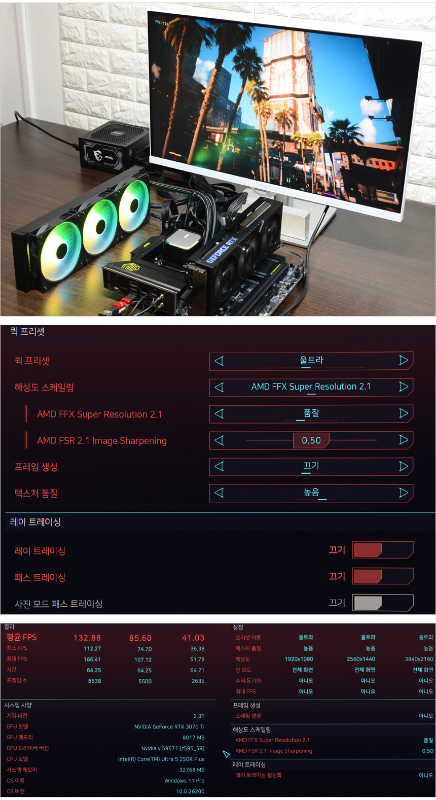 사이버펑크 2077 벤치 테스트를 진행한 모습으로 4K 해상도에도 40프레임 이상으로 동작해 여유롭게 게임을 즐길 수 있다. RTX 5070 이상의 고성능 그래픽카드를 사용하면 4K 에서도 쾌적하게 게임을 즐길 수 있을 것이다.