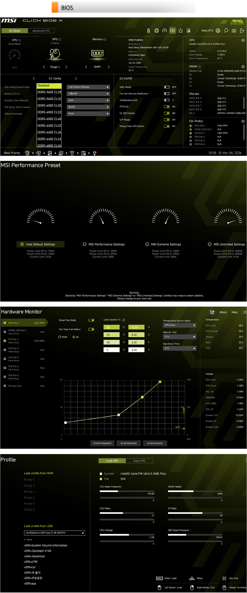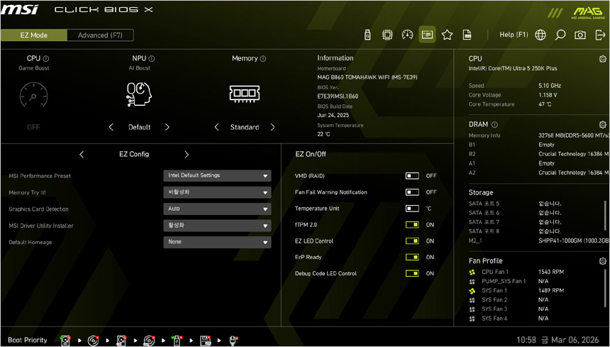 바이오스의 모습으로 PC 셋팅에 서투른 유저들도 손쉽게 메뉴를 조정할 수 있도록 EZ 모드를 제공한다. Z시리즈 메인보드와 달리 CPU 오버클럭은 지원하지 않지만 AI 부스트와 메모리 설정은 가능하며 퍼포먼스 프리셋에서 전력제한 해제도 가능해 더 강력한 성능으로 PC를 사용할 수 있다. (XMP 지원으로 튜닝램 사용이 용이하다.)