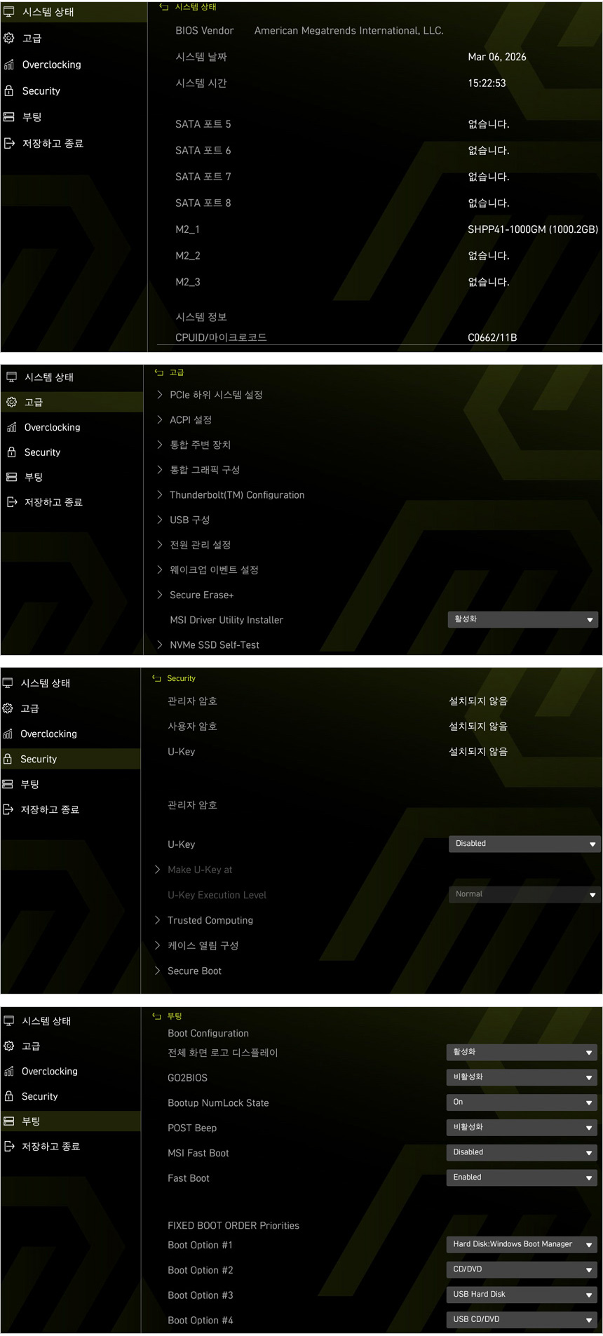 셋팅을 완료하고 바이오스와 윈도우에서 정보를 확인하고 있는 모습으로 (부팅시 DEL 키를 누르면 바이오스 진입가능) 정상적으로 작동되는 것을 확인할 수 있었다.