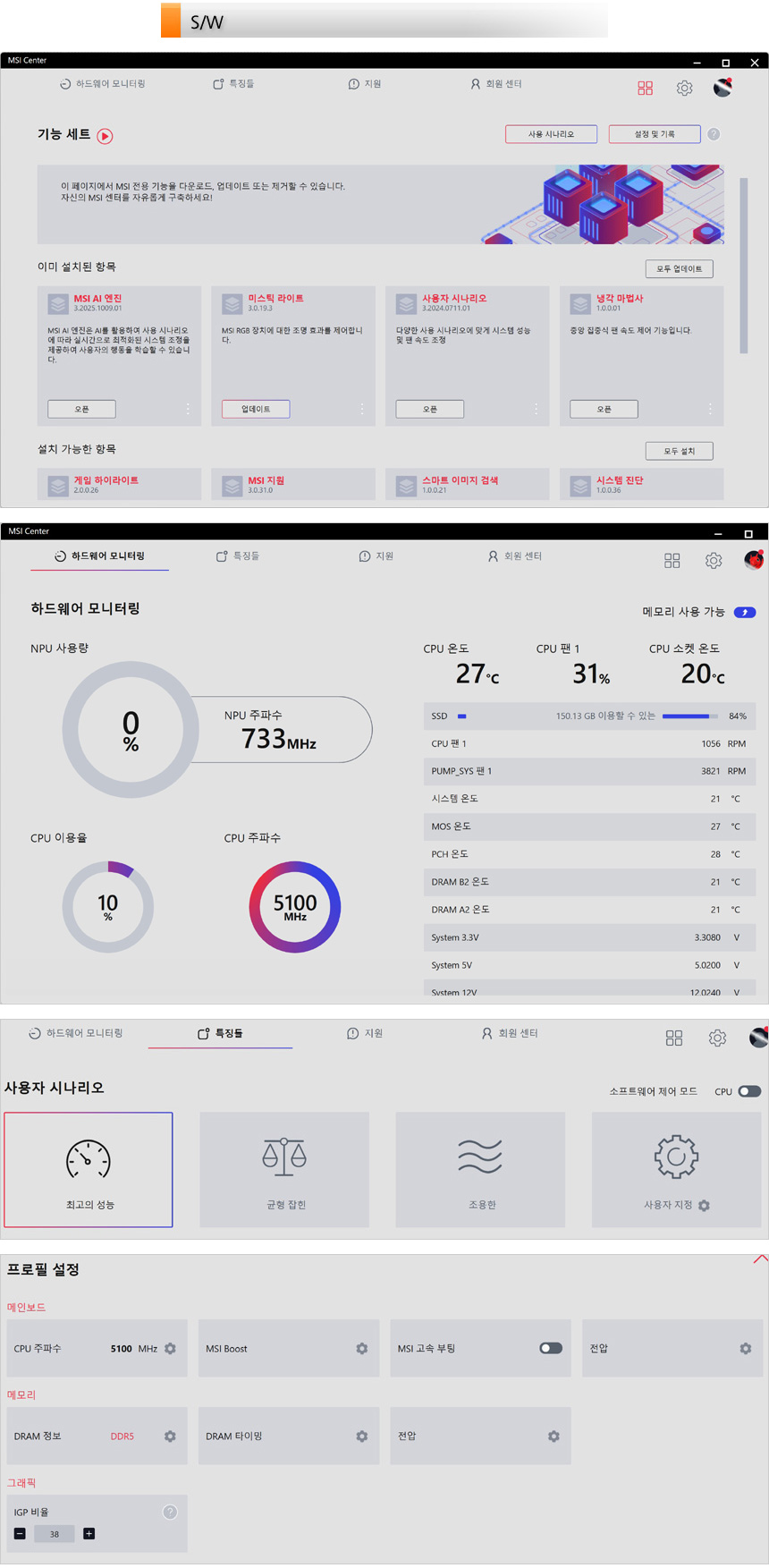 전용 S/W MSI 센터를 제공해 PC를 편하게 관리할 수 있다. (MS 스토어에서 프로그램 설치가 가능하다.) 모듈형으로 구성되어 원하는 앱을 손쉽게 설치하고 실행할 수 있으며 다양한 사용모드를 제공해 PC 사용목적에 따라 프로그램을 셋팅할 수 있다. 또한 시스템의 작동 상황을 한눈에 확인할 수 있도록 모니터링을 지원하고 사용자 시나리오를 통해 퍼포먼스도 설정할 수 있다.