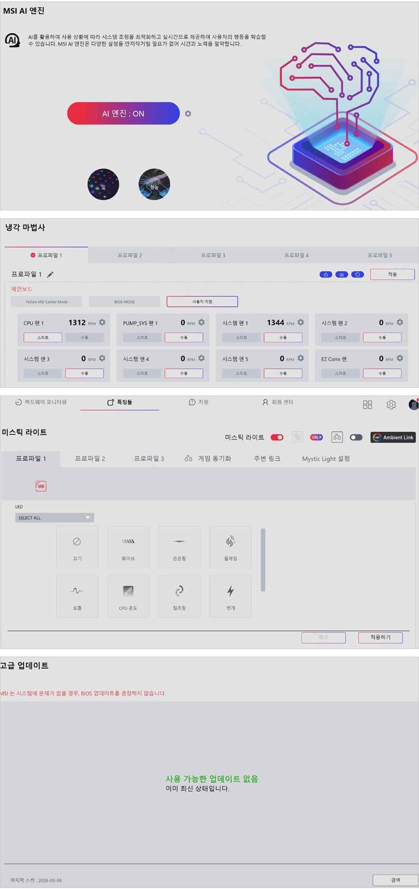 최적화된 시스템으로 PC를 사용할 수 있도록 AI 엔진을 제공하고 냉각마법사를 통해 팬속도 등을 조절할 수 있다. (MSI 그래픽카드를 사용하면 제로프로져와 쿨러부스트 설정도 가능하다.) 또한 미스틱 라이트 지원으로 조명 동기화가 가능하고 업데이트를 지원해 최상의 컨디션으로 PC를 사용할 수 있다.