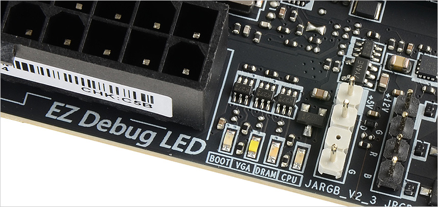 지원 커넥터의 모습으로 CPU 핀 헤더를 비롯해 수냉쿨러 워터펌프의 속도를 제어할 수 있도록 펌프 핀 헤더가 설치된 것을 확인할 수 있다. 또한 시스템 팬 사용을 위한 커넥터와 미스틱라이트를 위한 JARGB 헤더도 제공한다. 구형 PC와 달리 DEBUG LED가 부착되어 부팅시 발생되는 이상증상을 바로 파악할 수 있다. 전원 버튼을 누르면 차례대로 불이 켜지며 이상 유무를 알려준다. 부팅이 되지 않거나 오버클럭 등으로 PC상태를 확인해야 할 경우 무척 유용하다.