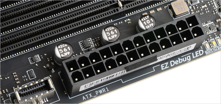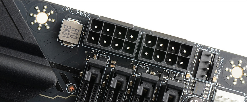 고성능 프로세서를 위한 메인보드 답게 8핀 + 8핀 CPU 전원부가 설치되어 있고 24핀 통합 전원부를 지원한다. 이 제품은 CPU 및 시스템 전체를 과전압으로부터 보호하는 회로 설계로 안정성을 높였으며 디지털 전원 설계를 통해 CPU에 정밀하고 빠른 전력을 공급한다. 또한 2개의 8핀 커넥터가 멀티코어 프로세서의 추가적인 전력을 확보해 전압강하로 인한 시스템 불안정 현상없이 깔끔하게 PC를 사용할 수 있다.
