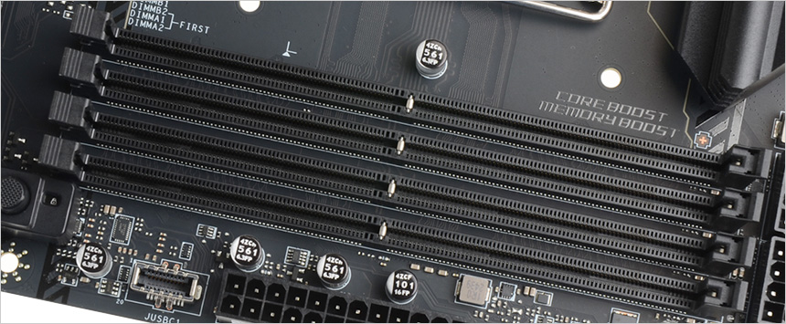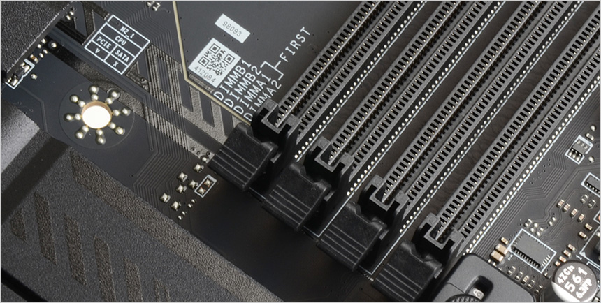 4개의 메모리 슬롯이 제공되며 최대 9200+ MT/s 의 DDR5 OC 메모리 사용이 가능하다. XMP 셋팅을 제공해 기본 메모리 뿐만 아니라 고클럭을 지원하는 튜닝램을 장착해 성능을 높일 수 있으며 메모리 장착 우선순위가 메인보드에 프린팅 되어 듀얼채널 구성시 빠르게 메모리를 장착할 수 있다.