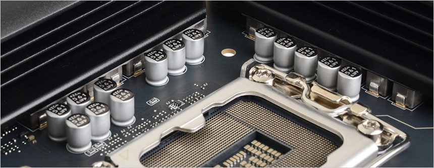 전원부의 모습으로 12+1+1+1 디지털 전원부로 높은 성능과 안정성을 제공하며 6레이어 PCB 설계는 물론 2oz 두께의 구리 PCB 및 NPG-170D 서버 등급의 PCB 설계로 데이터 전송 신뢰성은 물론 안정성을 한층 높였다. 또한 발열로 인한 문제를 미연에 방지하기 위해 대형 히트싱크가 전원부에 부착된 것을 확인할 수 있다. (내부에는 고품질의 7W/mK 모스펫 써멀패드가 설치되어 최상의 성능을 구현할 수 있도록 돕는다.)