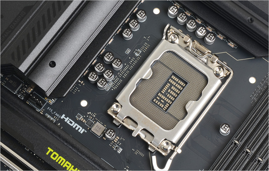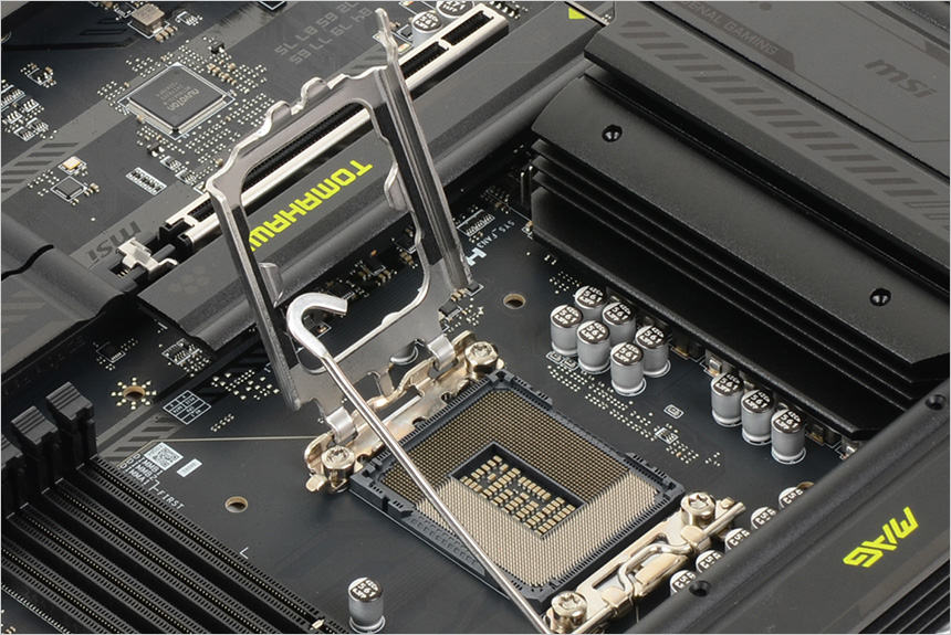 CPU 소켓의 모습으로 LGA 1851 소켓이 적용된 것을 확인할 수 있다. (새롭게 출시되는 에로우레이크와 호환된다.) 사방에 홀이 설치되어 인텔 기본쿨러를 비롯해 다양한 공랭 & 수랭 쿨러를 장착할 수 있으며 걸쇠를 눌러 풀어주고 가이드를 들어 올린 후 CPU를 내려놓고 가이드를 내리고 걸쇠를 채워주면 CPU를 장착할 수 있다. CPU에 홈이 한방향에만 설치되어 기존 프로세서 대비 편하게 위치를 확인할 수 있다.
