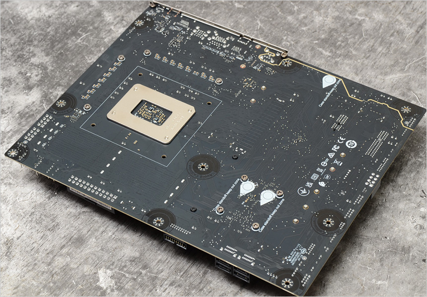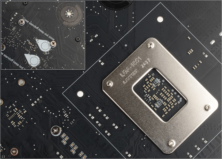 메인보드 바닥면의 모습으로 깔끔하게 디자인된 것을 확인할 수 있다. 특히 스탠드 오프나 기타 이물질과 잦은 접촉으로 인한 메인보드 고장을 미연에 방지하도록 Aviod Collision Zone을 적용한 것이 눈에 띈다.
