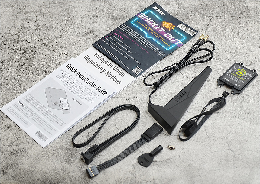 액세서리의 모습으로 박스 후면에 있는 QR코드를 스마트폰으로 스캔하면 사용설명서를 다운로드 받을 수 있으며 퀵 매뉴얼과 Wi-Fi 안테나를 비롯해 SATA 케이블, EZ클립 II, 클립 리무버, EZ Conn 케이블 등이 제공되는 것을 확인할 수 있다. 또한 PC케이스 전면부 케이블을 쉽게 연결할 수 있도록 프런트 패널 커넥터도 지원한다.