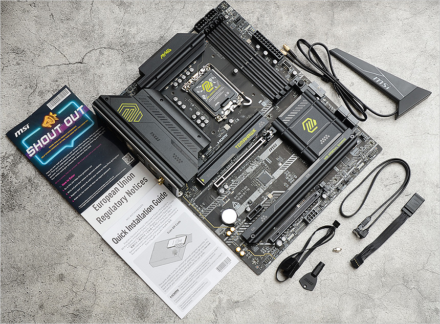 풀킷의 모습으로 메인보드를 비롯해 프런트 패널 커넥터, EZ Conn 케이블, EZ M.2 클립 리무버 등이 제공되며 퀵 매뉴얼과 Wi-Fi 안테나, SATA 케이블, EZ M.2 클립이 포함된 것을 확인할 수 있다. (참고로 사용설명서는 박스에 있는 QR코드 스캔을 통해 스마트폰에서 다운로드 할 수 있다.)
