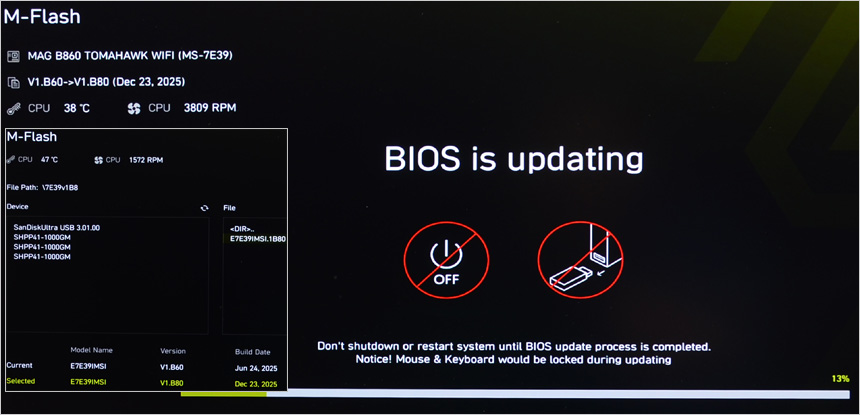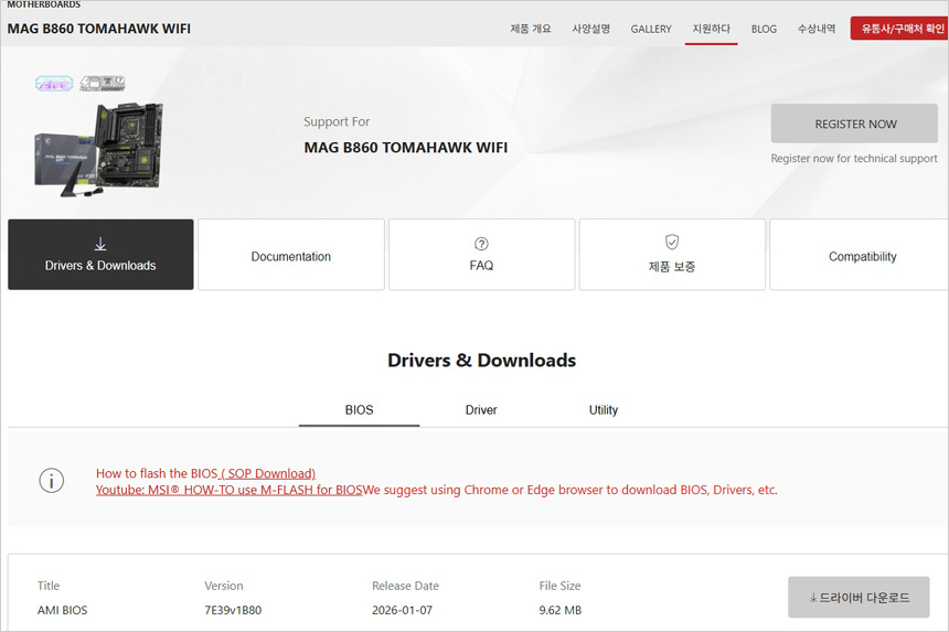 새로운 CPU가 장착되니 만큼 바이오스는 업데이트 하는 것을 권장한다. 상단의 사진은 최신 바이오스로 업데이트 하고 있는 모습으로 바이오스의 M-FLASH 메뉴로 들어가면 쉽게 진행할 수 있다. (초보자도 할 수 있을만큼 쉽다.) 이 제품은 고급형 모델답게 바이오스 초기화와 업데이트 버튼이 제공되어 바이오스에 진입하고 않고 간단하게 업데이트를 할 수 있다. @ 최신 바이오스는 MSI 홈페이지에서 다운로드 받을 수 있다.