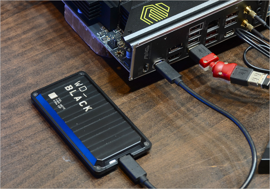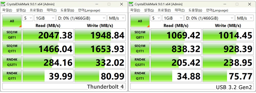 상단에서 언급한 것과 같이 썬더볼트 4 단자를 지원해 초고속 데이터 전송이 가능하다. USB 3.2 Gen2x2 지원 외장 SSD를 장착해 속도 테스트를 진행해 보았는데 2,000MB/s 가 넘어가는 빠른 속도를 보여주었다. 대용량의 데이터를 다루는 유저들이라면 유용하게 활용할 수 있을 것이다.