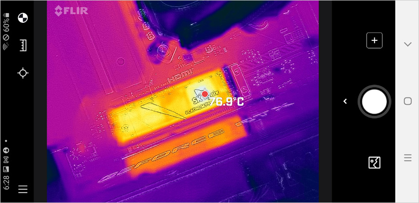 메인 M.2 SSD 슬롯에는 쉴드프로저를 제공할 뿐만 아니라 써멀패드가 부착되어 열로 인한 M.2 SSD의 스로틀링 현상을 방지할 수 있다. 상단의 사진은 PCIe 4.0 NVMe SSD의 표면온도를 확인하고 있는 모습으로 (크리스탈 디스크마크 읽기/쓰기 3회 실행후 온도) SSD 만 장착되어 있을 때 표면 온도가 70도 후반까지 올라가는데 반해 히트싱크를 장착하면 표면 온도가 대폭 낮아지는 것을 확인할 수 있었다.