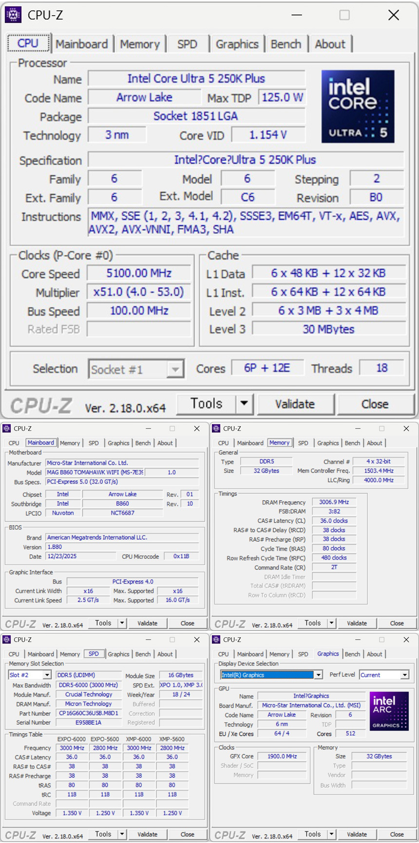 프로세서와 시스템 정보를 확인하기 위해 CPU-Z를 실행한 모습으로 125W TDP를 지원하며 (최대 터보성능 에서는 159W) 6+12코어에 18스레드로 구성된 것을 확인할 수 있다. (하이퍼스레딩은 지원하지 않는다.) 또한 L2캐시가 30MB로 늘어났으며 30MB의 L3 캐시를 지원한다. (K모델의 경우 내장그래픽을 활용할 수 있다.)
