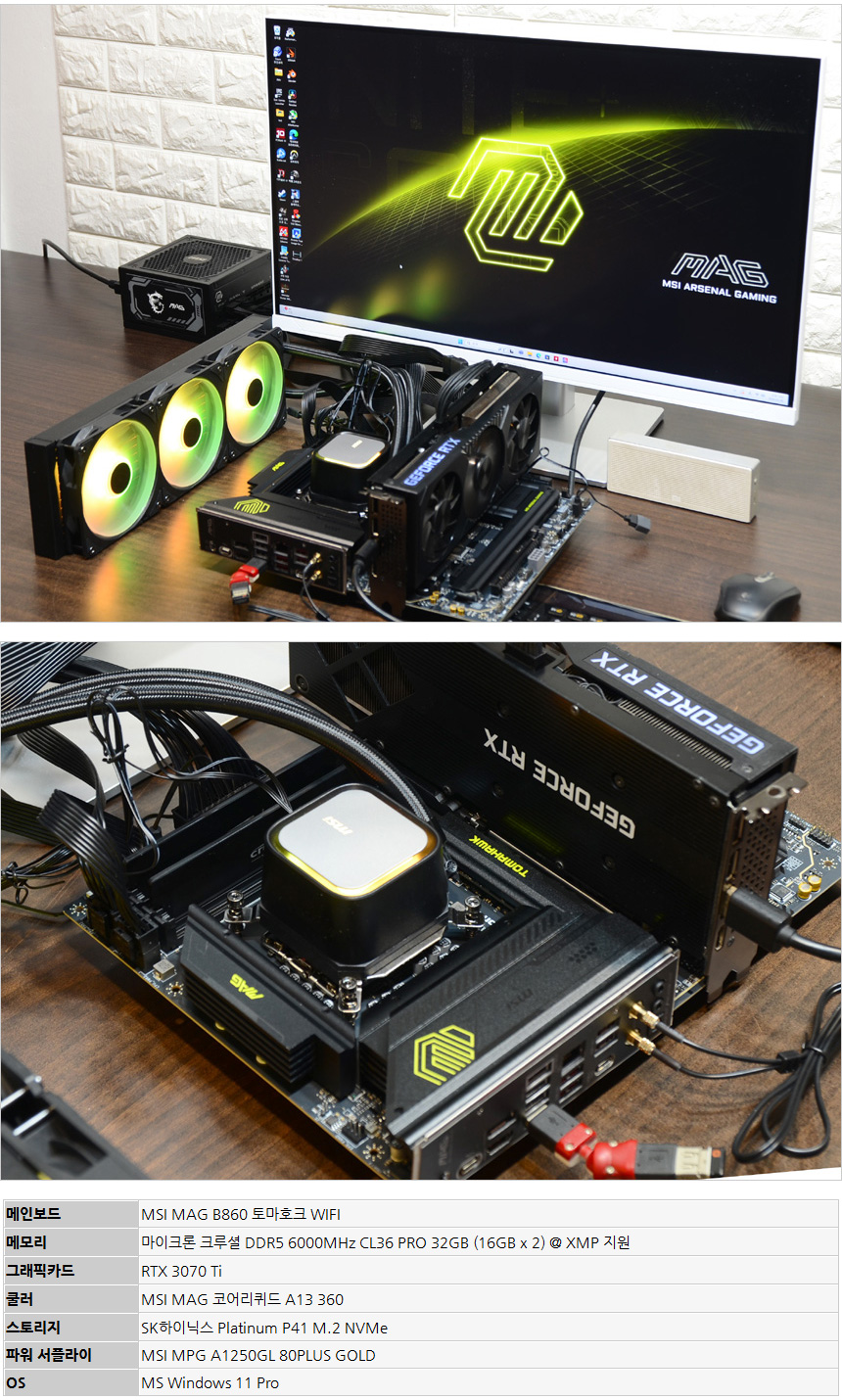 테스트를 위해 시스템을 구성한 모습으로 인텔코어 울트라 200S Plus 시리즈 프로세서와 완벽 호환되는 MSI MAG B860 박격포 WIFI 메인보드를 사용했으며 (바이오스는 최신으로 업데이트 했다.) 메모리는 32GB 듀얼채널 튜닝램을 장착했다. 또한 RTX 3070 Ti 그래픽카드와 최상급 SSD인 SK하이닉스 P41을 장착했다.