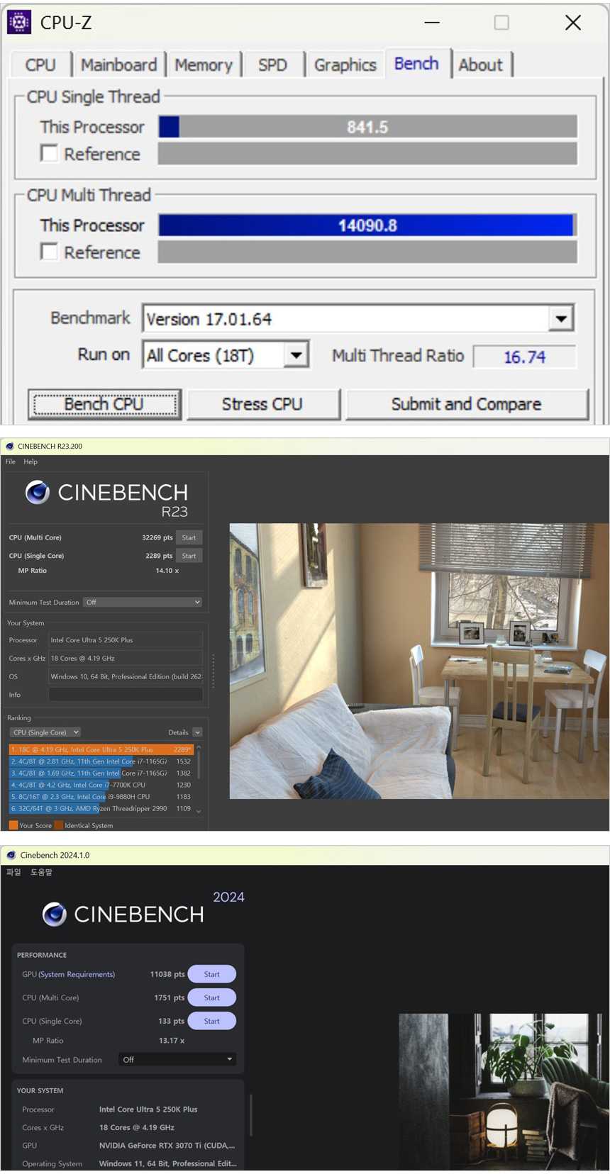 벤치마크 프로그램을 이용해 성능을 확인하고 있는 모습으로 코어와 캐시가 늘어난 만큼 성능에서 (245K 대비) 분명한 차이를 보여주었다. 싱글코어 스코어는 대동소이 한데 반해 체감성능에 큰 영향을 미치는 멀티코어 스코어가 상당히 높아진 것이 눈에 띈다. 245K 의 CPUZ-Z 멀티스레드 스코어가 10819.9였는데 14090.8 까지 높아졌으며 씨네벤치 R23 멀티는 25024에서 32269, 씨네벤치 2024 멀티는 1451에서 1751 로 높아진 것을 확인할 수 있었다.