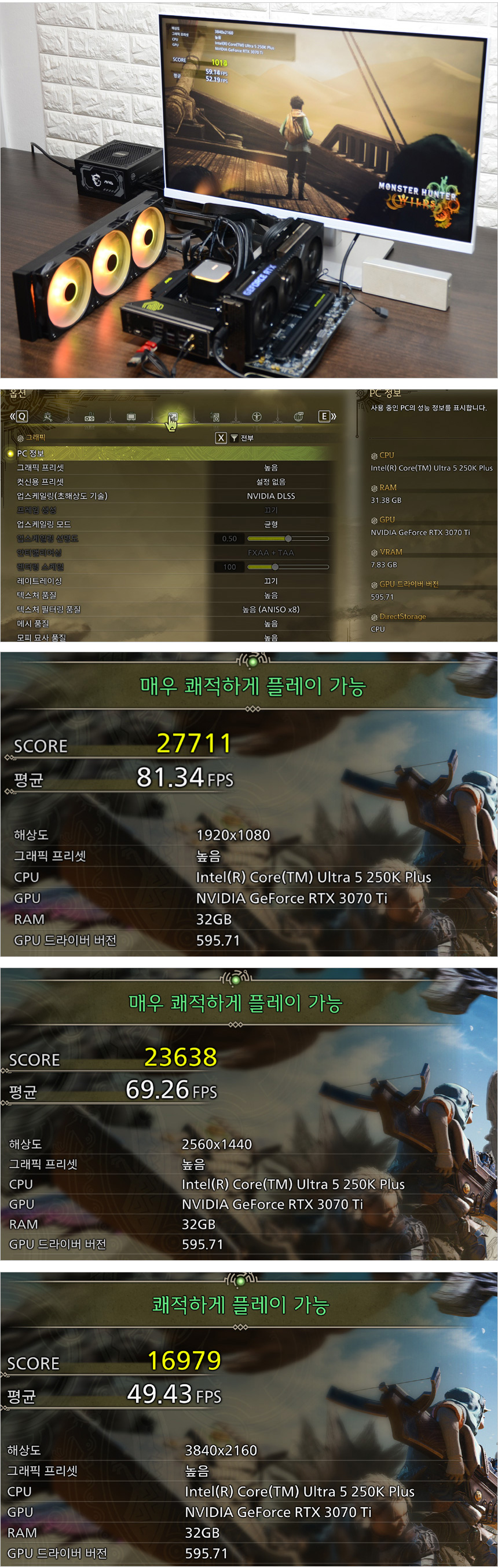 몬스터 헌터 와일드 벤치마크를 실행한 모습으로 4K 에서도 높은 프레임을 보여주었다. DLSS4를 적극적으로 활용할 수 있는 RTX 5060 Ti 정도의 그래픽카드를 사용한다면 훨씬 높은 프레임에서 게임을 즐길 수 있다.