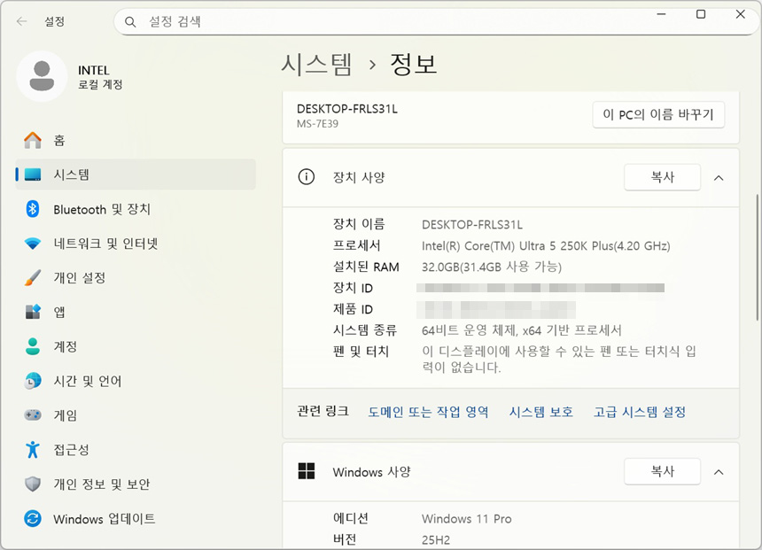 조립과 OS 설치와 같은 기본 셋팅을 마치고 바이오스에 진입한 모습으로 CPU 가 정상적으로 인식되는 것을 확인할 수 있었다. (튜닝램을 사용해 XMP도 조정할 수 있고 AI 부스트도 활성화 할 수 있다.) 또한 시스템 정보를 확인했을때 정상적으로 CPU가 인식되는 것을 확인할 수 있었다.