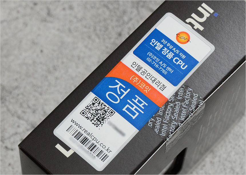 인텔 정품 CPU는 PC에 익숙지 않는 유저들도 쉽게 정품 여부를 확인할 수 있도록 박스 측면에 스티커를 부착한다. 사진과 같이 정품 스티커가 부착된 모델의 경우 3년 무상 A/S가 가능한 모델이라고 생각하면 된다. 비정품 CPU가 정품 CPU로 둔갑하는 것을 방지하기 위해 QR코드도 제공한다. 스마트폰의 QR코드 스캔 기능을 실행한 후 QR코드를 스캔하면 사진과 같이 정품검색 여부를 알려준다.