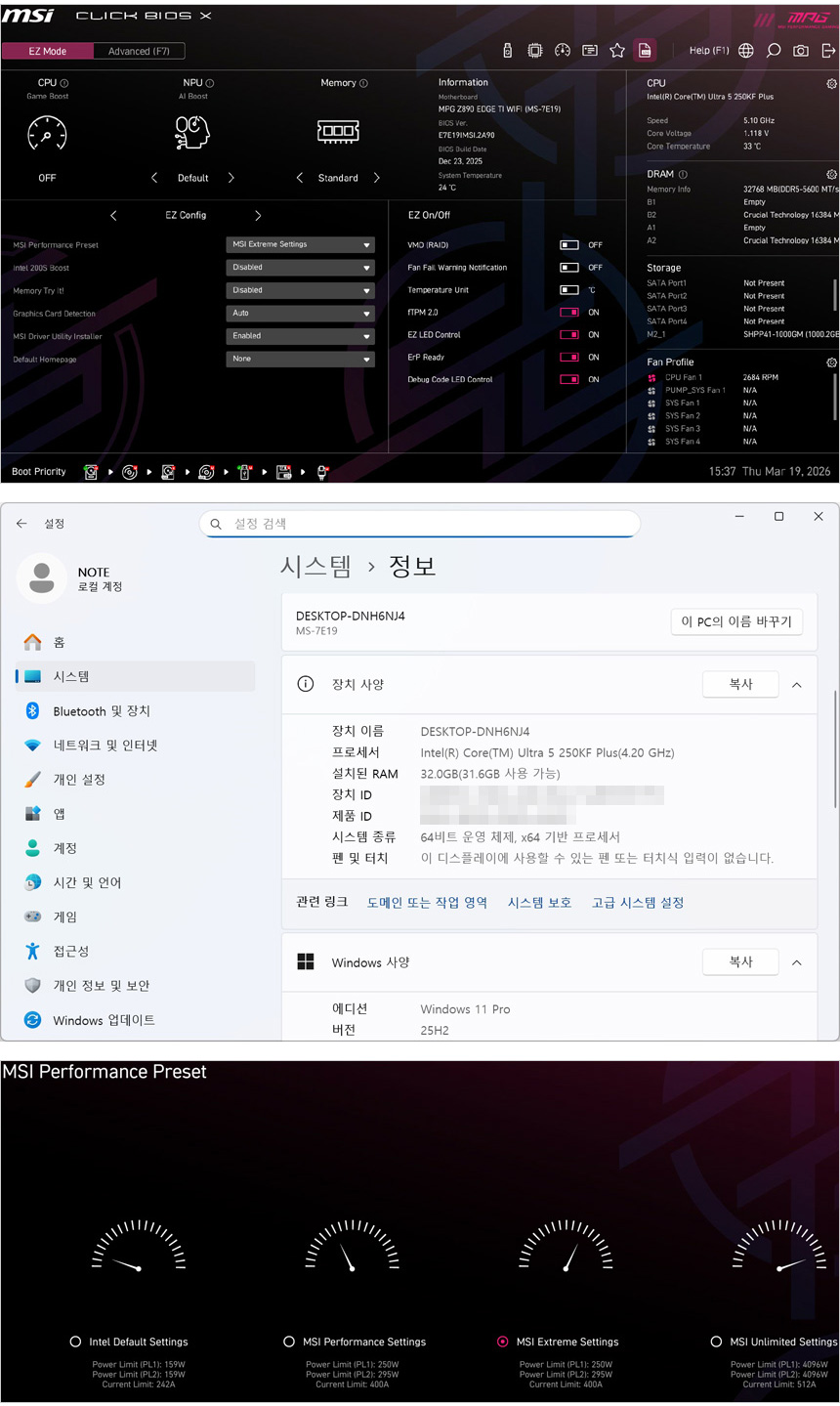 기본 셋팅후 바이오스에 진입한 모습으로 배수락이 해제된 CPU 답게 원터치 오버클럭 기술인 게임부스트를 활성화 할 수 있고 튜닝램을 사용해 XMP도 조정할 수 있는 것을 확인할 수 있다. 또한 윈도우 11 설치후 장치관리자에 진입했을 때 정상적으로 CPU가 인식되는 것을 확인할 수 있었다. @ CPU가 최고 성능으로 동작할 수 있도록 메인보드 퍼포먼스 프리셋에서 익스트림 셋팅을 적용해 테스트를 진행했다.