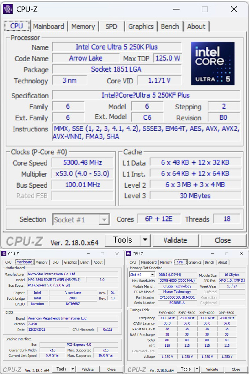 프로세서 정보를 확인하기 위해 CPU-Z를 실행한 모습으로 125W TDP를 지원하며 (최대 터보성능 에서는 159W) 6+12코어에 18스레드로 구성된 것을 확인할 수 있다. (하이퍼스레딩은 지원하지 않는다.) 또한 L2캐시가 30MB로 늘어났으며 30MB의 L3 캐시를 지원한다.