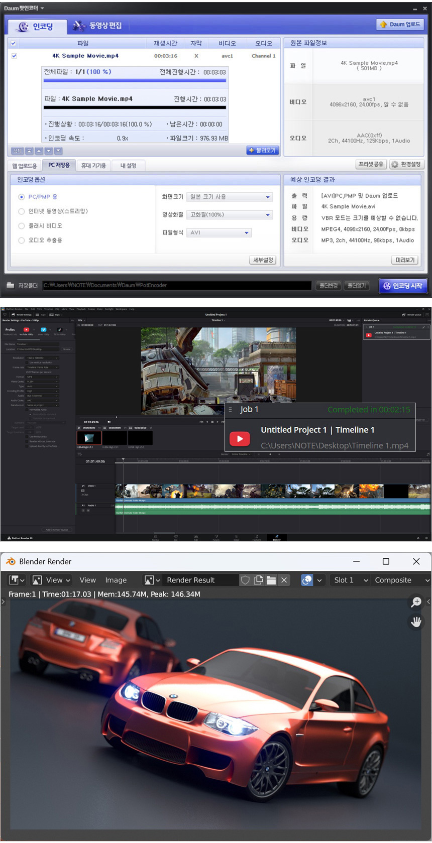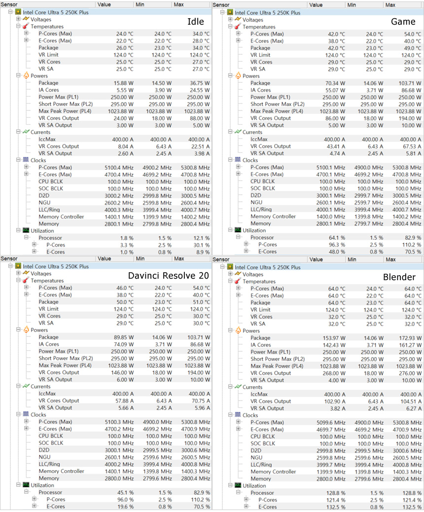 체감성능 확인을 위해 인코딩과 랜더링 테스트를 진행했는데 인코딩은 5초 정도 단축 되었으며 CPU 사용율이 극히 높은 블랜더 랜더링의 경우 1분 38초에서 1분 17초로 시간이 단축되었다. (다빈치리졸브 랜더링은 사용했던 S/W 버전이 달라 비교가 불가하다. 상당히 빠른 속도라는 것을 알려드린다.) 영상편집이나 랜더링 등의 작업용으로는 울트라 7이나 9을 추천했는데 가볍게 프로그램을 사용하는 유저들이라면 인텔코어 울트라5 250KF Plus 만으로도 충분히 만족스런 성능을 경험할 수 있을 것이다.