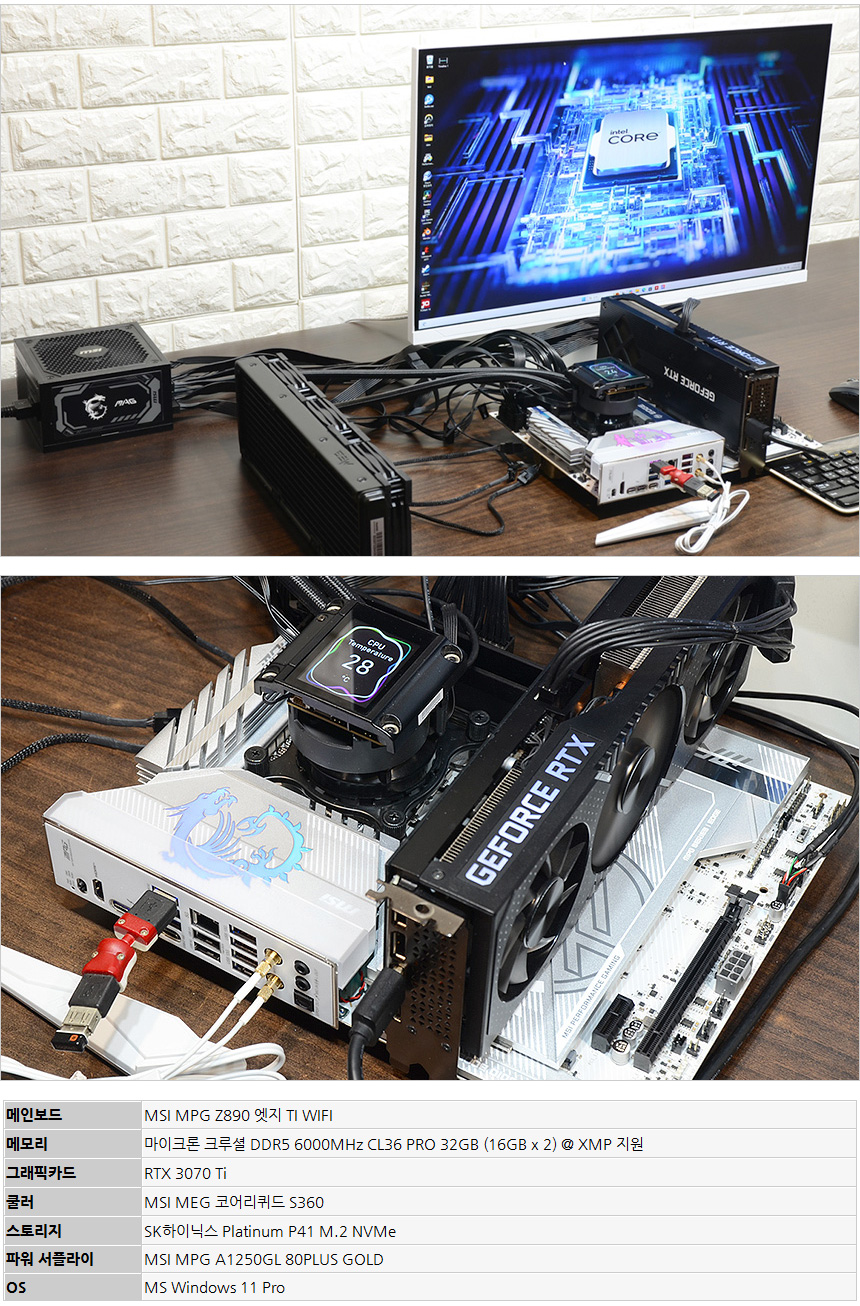 테스트에 사용된 MSI MPG Z890 엣지 TI WIFI 메인보드 는 오버클럭이 가능한 K프로세서에 특화된 최고급형 모델로 블랙컬러 일색의 일반 메인보드와 달리 화이트 컬러를 지원해 최근 유행하는 화이트PC를 만드는데 유용하게 활용할 수 있다. 또한 미스틱 라이트를 적극 적용해 아름다운 조명 효과를 즐길 수 있다.