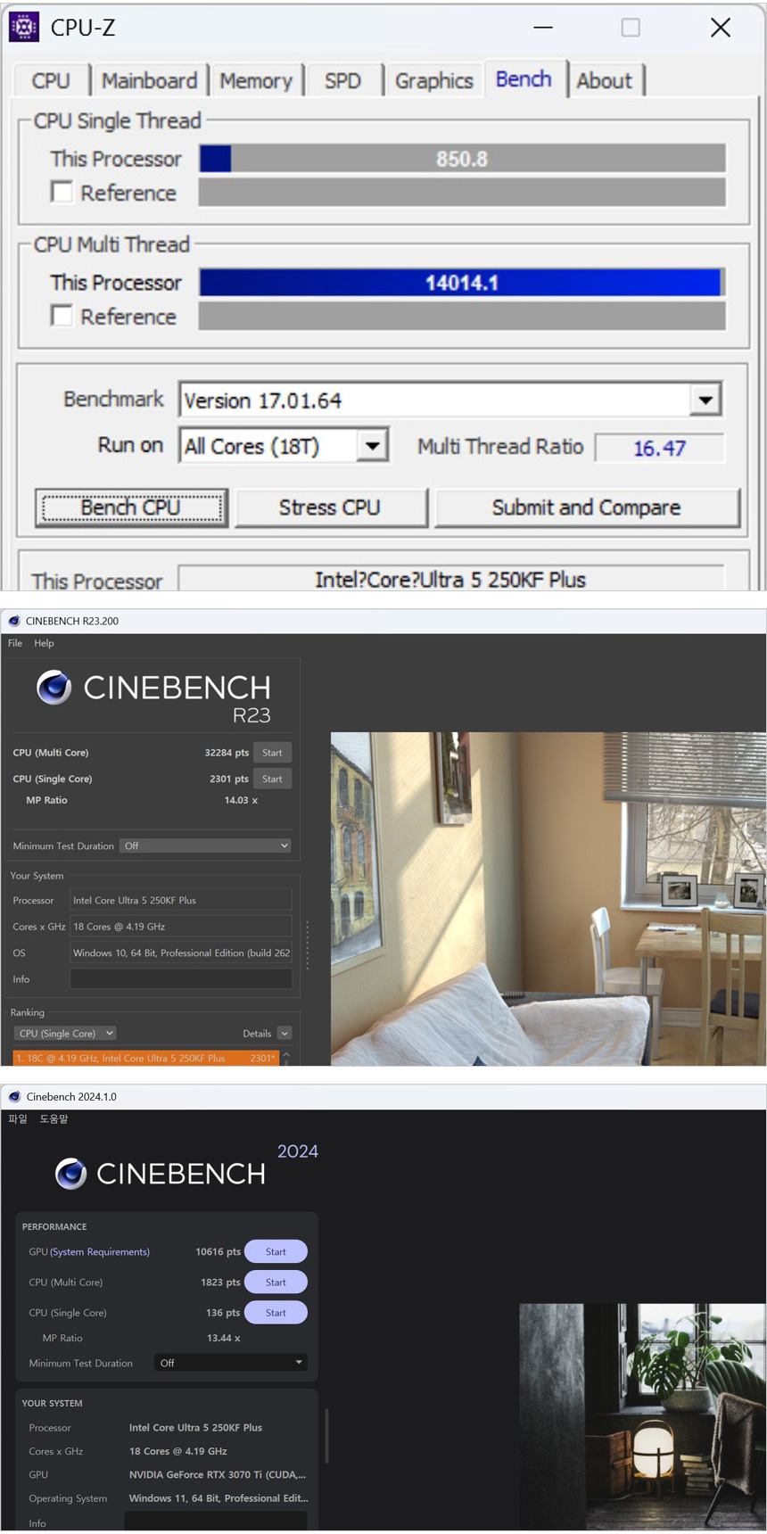 벤치마크 프로그램을 이용해 성능을 확인하고 있는 모습으로 코어와 캐시가 늘어난 만큼 성능이 상당히 향상된 것을 확인할 수 있었다. (245K 대비) 싱글코어 스코어는 대동소이 한데 반해 체감성능에 큰 영향을 미치는 멀티코어 스코어가 상당히 높아진 것이 눈에 띈다. 245K 의 CPUZ-Z 멀티스레드 스코어가 10819.9였는데 14014.1 까지 높아졌으며 씨네벤치 R23 멀티는 25024에서 32284, 씨네벤치 2024 멀티는 1451에서 1823 로 높아진 것을 확인할 수 있었다.