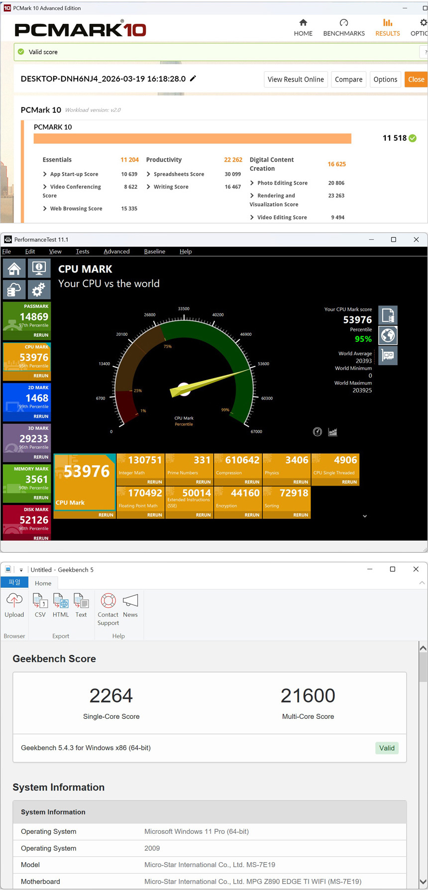 PC의 전반적인 성능을 나타내는 PCMARK10 의 경우 9321에서 11518 으로 높아졌으며 패스마크 CPU 마크는 44082에서 53976 으로 으로 상당히 상승했음을 알 수 있었다. 또한 긱벤치 5를 실행했을 때 멀티스코어가 18440 이 21600 으로 높아졌다.
