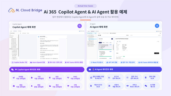 엠클라우드브리지는 Azure OpenAI, Google Gemini, Microsoft Fabric, Databricks 등 멀티 클라우드·데이터·AI 기술을 기반으로 한 데이터·AI 전문 기업으로, Ai 365 Orchestration Platform을 통해 엔터프라이즈 AI Agent Orchestration 역량을 고도화해 왔다. Ai 365 Orchestration Platform은 지식 에이전트, 데이터 에이전트, 업무 에이전트, 보안 에이전트 등을 하나의 플랫폼에서 구성·운영할 수 있는 기업용 Agentic AI 플랫폼으로, Microsoft 365 Copilot, Copilot Studio, Power Automate, Azure OpenAI와 연계해 Copilot Agent와 AI Agent 병행 전략을 구현하도록 설계됐다.